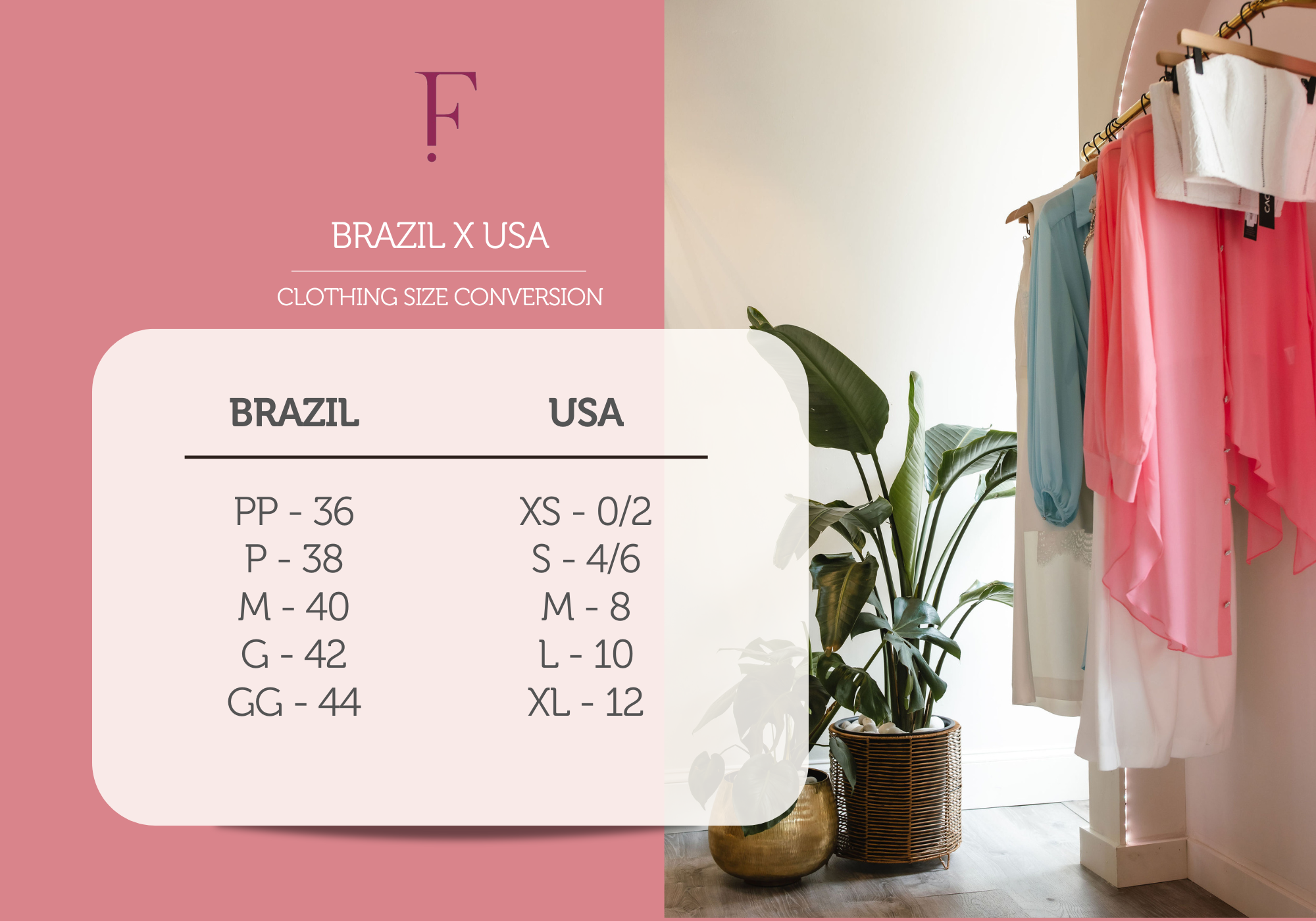 As a Premium Brazilian Fashion Boutique, here at Frida our products come 100% from Brazil, to help you find the best size for you we have our Brazil X USA Size Chart.